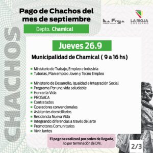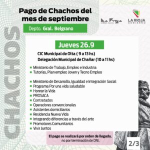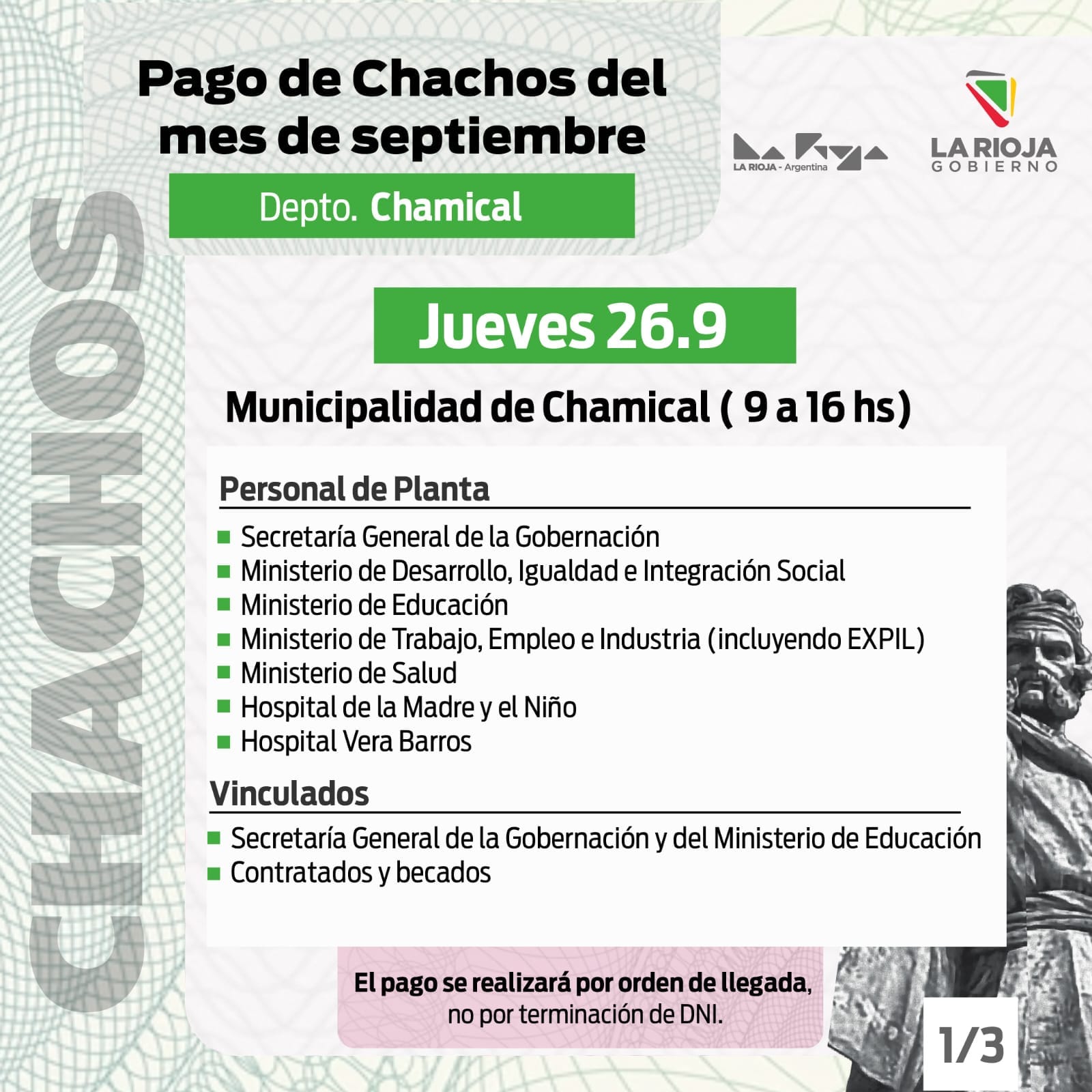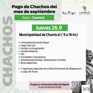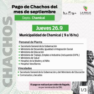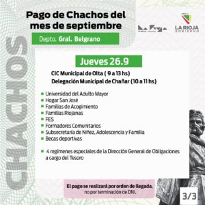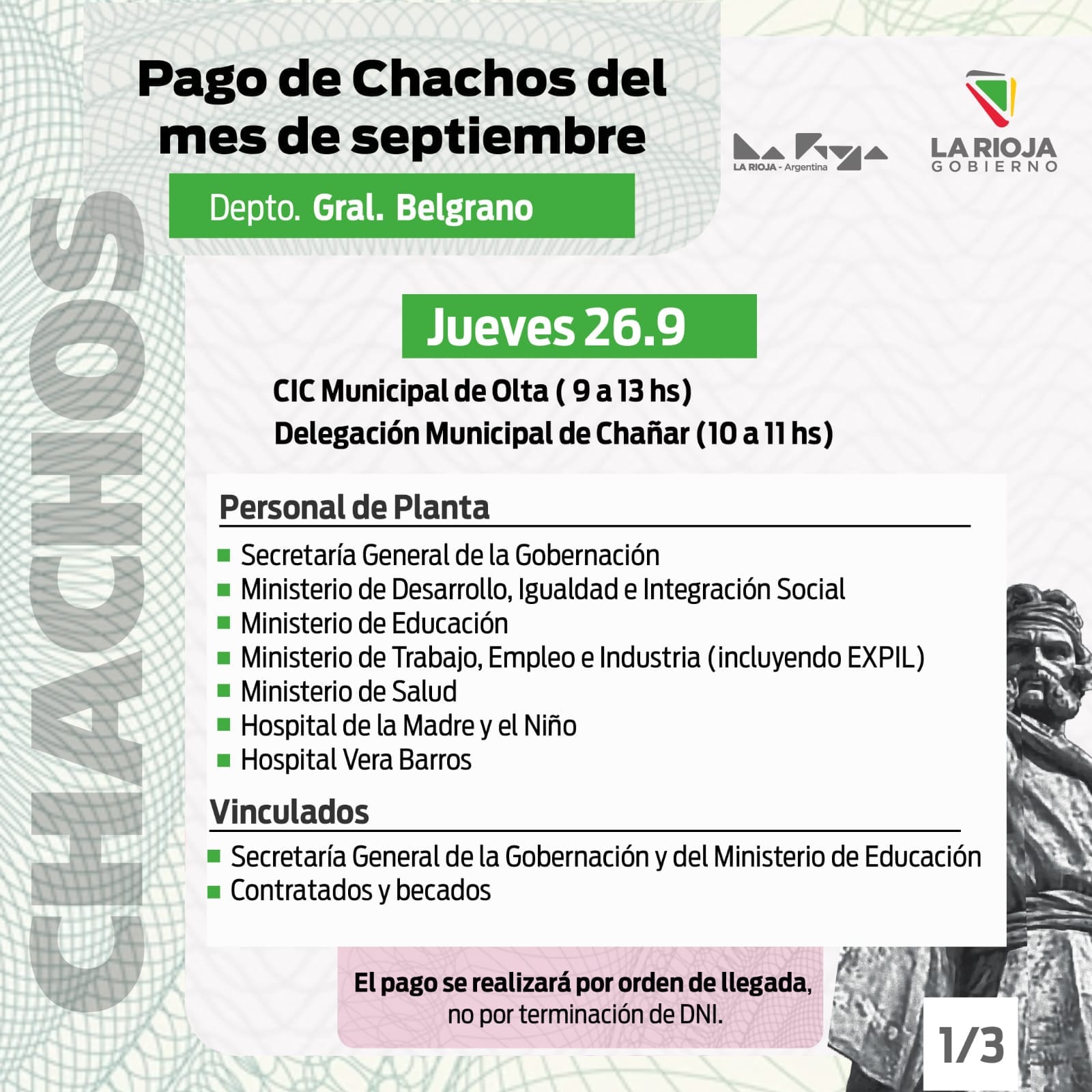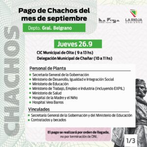 El Gobierno de La Rioja recuerda que, hoy jueves 26 de septiembre continúa el pago de bonos de cancelación de deuda Chachos, a trabajadoras y trabajadores de planta y vinculados de la Administración Pública Provincial (APP) de Capital y de los departamentos General Belgrano, Chamical y Chilecito.
