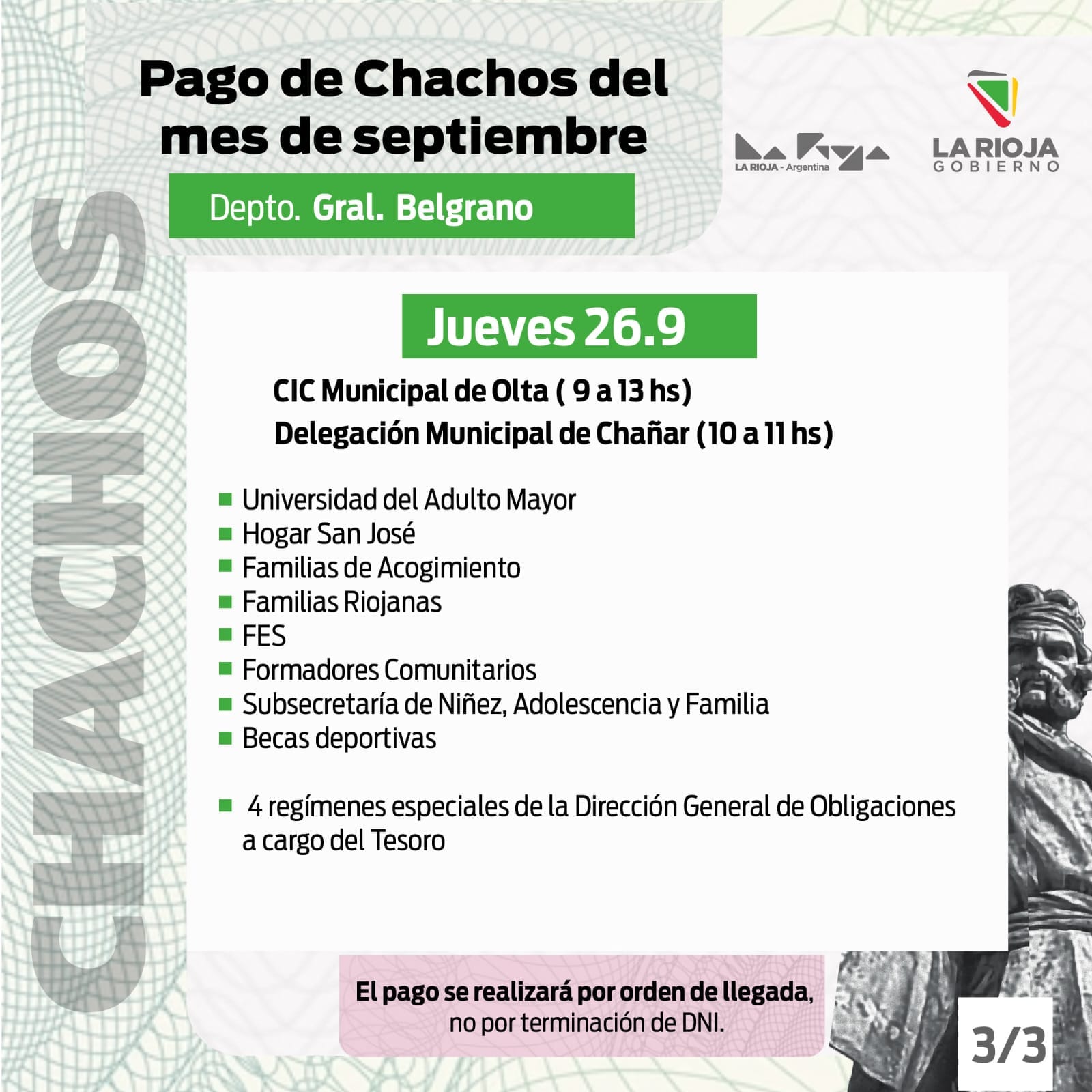 En el departamento General Belgrano, el pago se realizará en el CIC Municipal de Olta, en el horario de 9 a 13 horas y también en la Delegación Municipal de Chañar 10 a 11 horas.