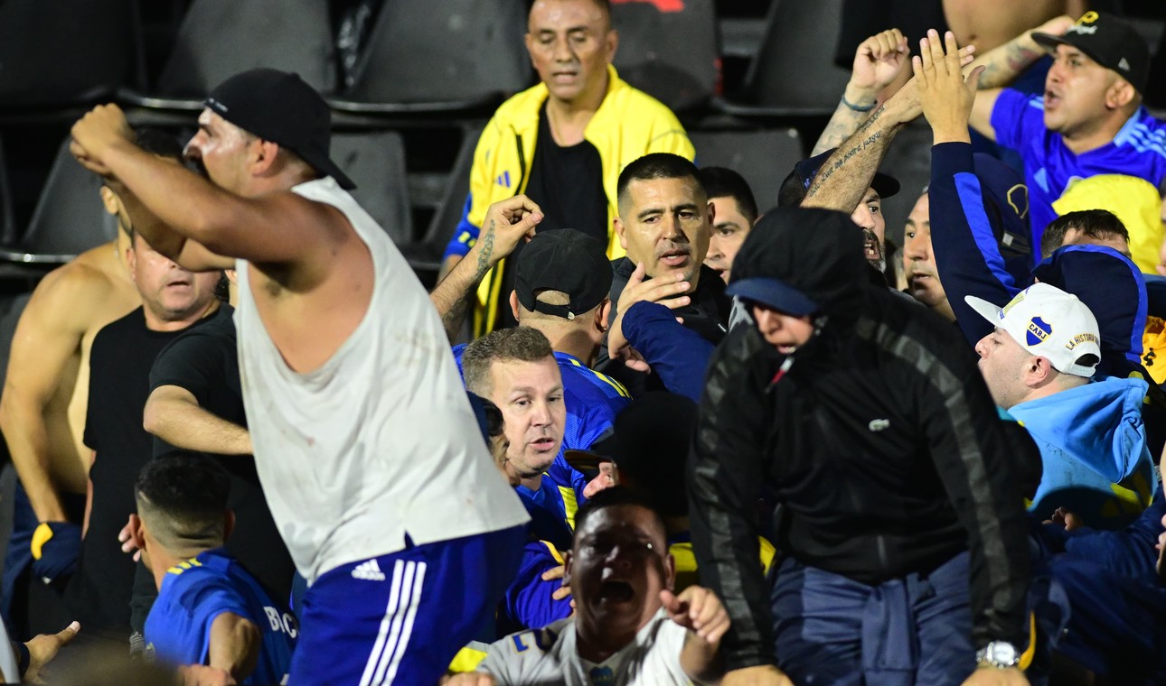 Fue allí que irrumpió Juan Román Riquelme, presidente del club de La Ribera, en la platea. Y se puso entre la barra y la policía. Acompañado por Raúl Cascini y Chicho Serna, con gestos y aspavientos, le pidió a La Doce, que tuvo al Lana Gatica y Topadora Kruger entre los cabecillas de la avanzada, que volviera a su lugar. Y luego de varios minutos de charla, lo fue consiguiendo, más allá de que la tensión continuó y por algunos minutos las butacas siguieron surcando el cielo de Rosario.