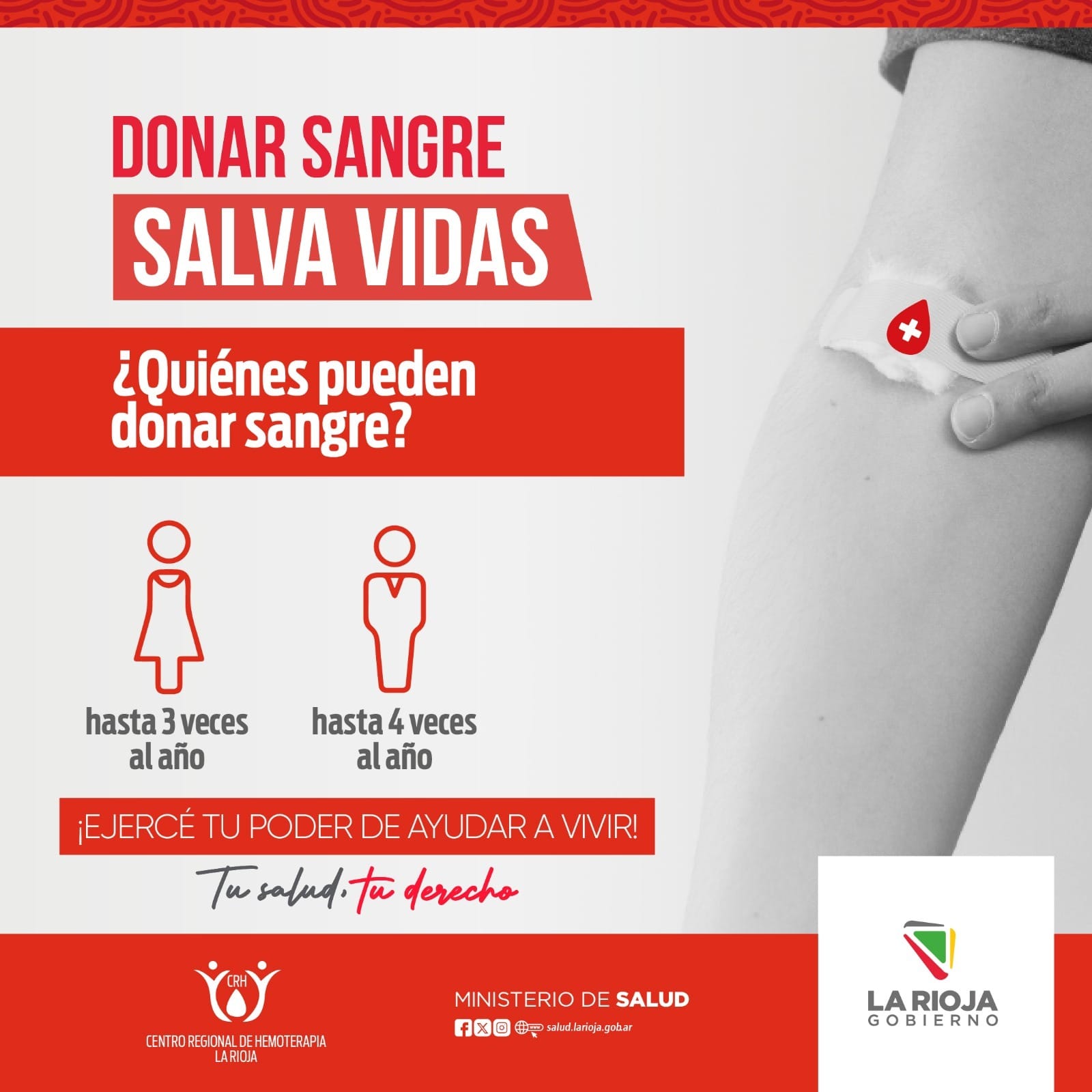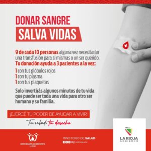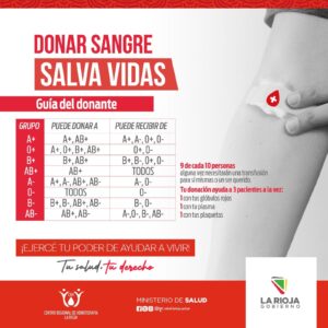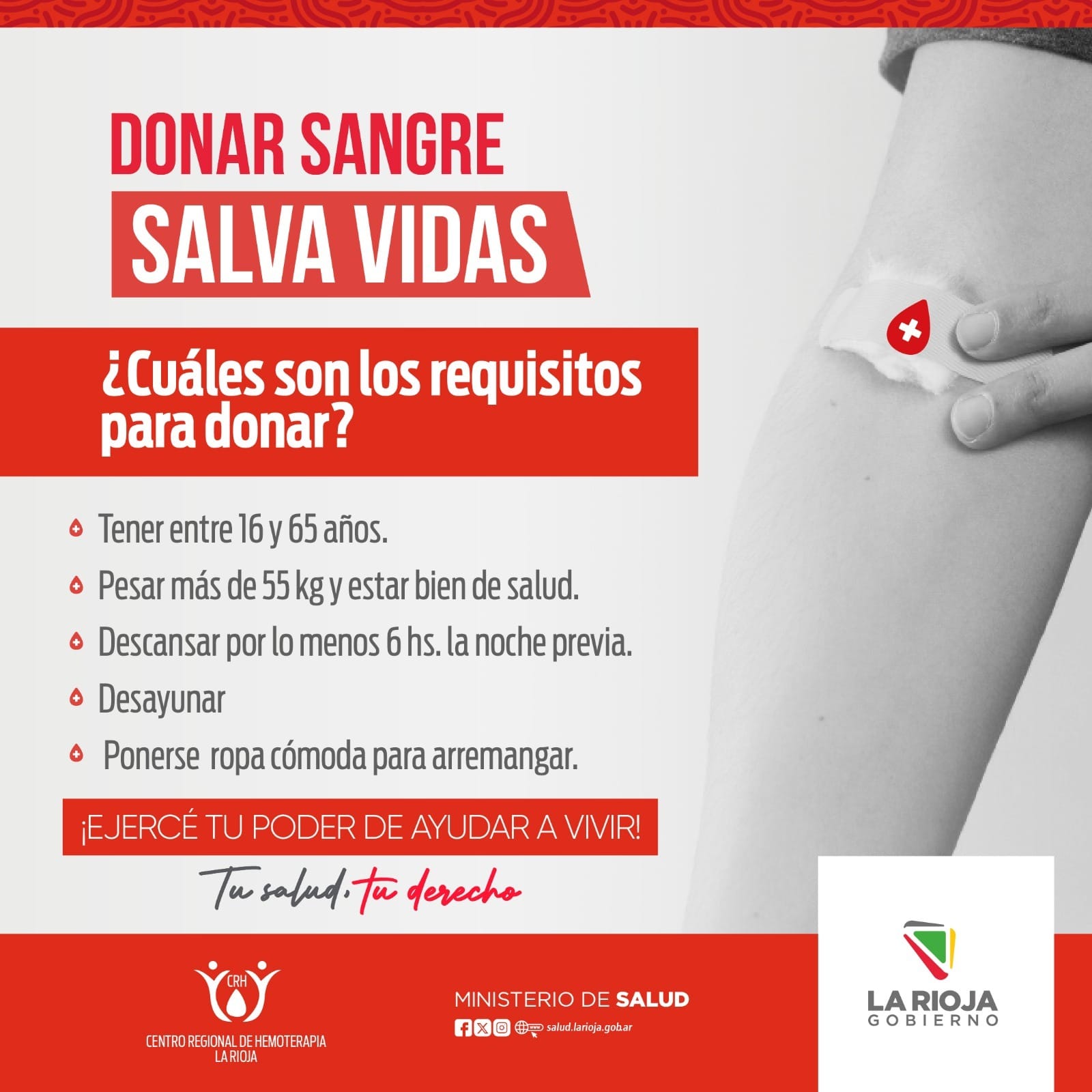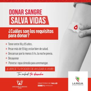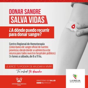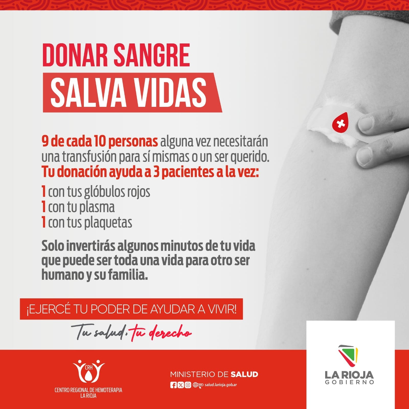 El Ministerio de Salud, a través del Centro Regional de Hemoterapia, convoca a las personas mayores de 18 años a donar sangre. Cada donación puede salvar la vida de pacientes en situaciones críticas, desde accidentes hasta intervenciones quirúrgicas y tratamientos para enfermedades crónicas.