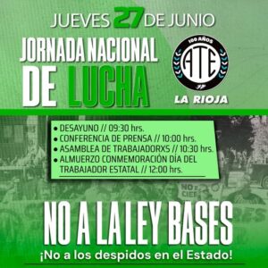 InicioDepartamentalesJornada Nacional de Lucha Departamentales Jornada Nacional de Lucha By cadenadelosllanos 26 junio, 2024 0 25 Cuota FacebookTwitterPinterestWhatsApp *Jueves 27 de Junio-10 Hrs. Alberdi 313* (Sede ATE-CTAA) ¡No a la Ley Bases! ¡Basta de despidos en el Estado! ¡La Patria no se vende! *Cronograma* Desayuno *09:30* Conferencia de prensa *10:00 hrs.* Asamblea de trabajadores *10:30 hrs.* Almuerzo conmemoración día del trabajador estatal *12:00 hrs* Cuota FacebookTwitterPinterestWhatsApp Artículo anteriorLanzan la colecta solidaria “Dame tu mano”Artículo siguienteJornada de trabajo multisectorial cadenadelosllanos ARTICULOS RELACIONADOS Departamentales Gabriela Pedrali se reunió con mujeres emprendedoras del programa “Revolucioná tu Emprendimiento” 17 octubre, 2025 Departamentales Quintela celebró los 55 años de la Residencia San José y ratificó el compromiso del Gobierno provincial con los adultos mayores 17 octubre, 2025 Departamentales Mes Rosa en Vinchina 17 octubre, 2025 DEJA UNA RESPUESTA Cancelar respuesta Comentario: Por favor ingrese su comentario! Nombre:* Por favor ingrese su nombre aquí Correo electrónico:* ¡Has introducido una dirección de correo electrónico incorrecta! Por favor ingrese su dirección de correo electrónico aquí Sitio web: Guardar mi nombre, correo electrónico y sitio web en este navegador la próxima vez que comente. Δ - Publicidad - Mas Leidas Gabriela Pedrali se reunió con mujeres emprendedoras del programa “Revolucioná tu Emprendimiento” 17 octubre, 2025 Quintela celebró los 55 años de la Residencia San José y ratificó el compromiso del Gobierno provincial con los adultos mayores 17 octubre, 2025 Mes Rosa en Vinchina 17 octubre, 2025 POR UN ARAUCO MÁS ORDENADO Y CON SERVICIOS 17 octubre, 2025 Cargar más Ultimos comentarios Sr WordPress en ¡Hola mundo!