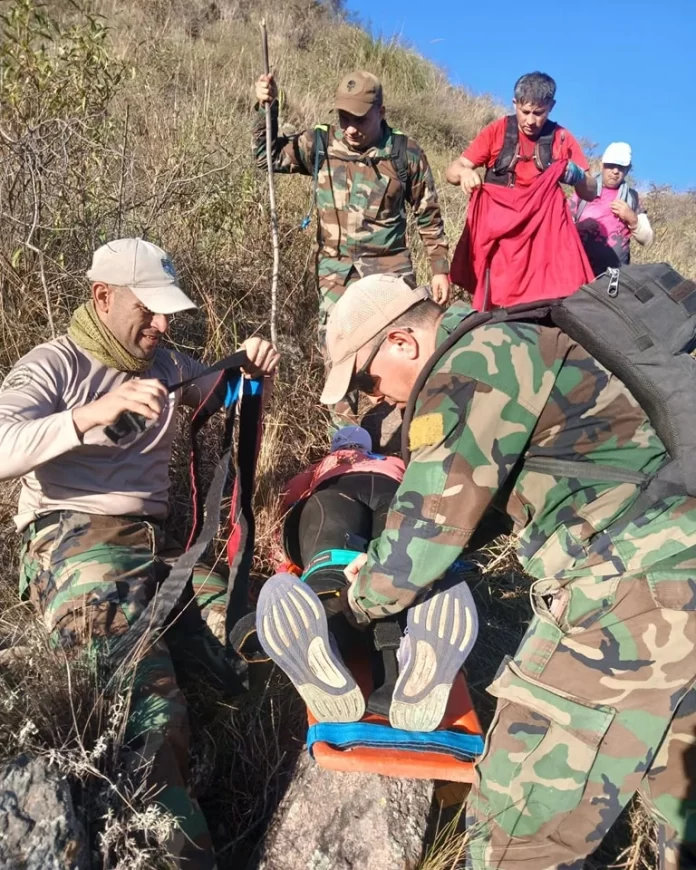 Casi cuatro horas de descenso con una mujer de apellido Tello, quien sufrió una lesión en miembro inferior (tobillo), lo que le impedía poder caminar, se inmoviliza en camilla rígida, en el camino personal policial encuentran aproximadamente unas 50 personas que bajaban con medallas.