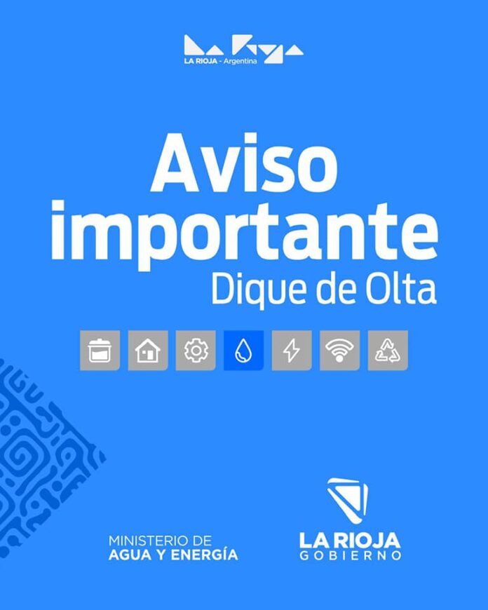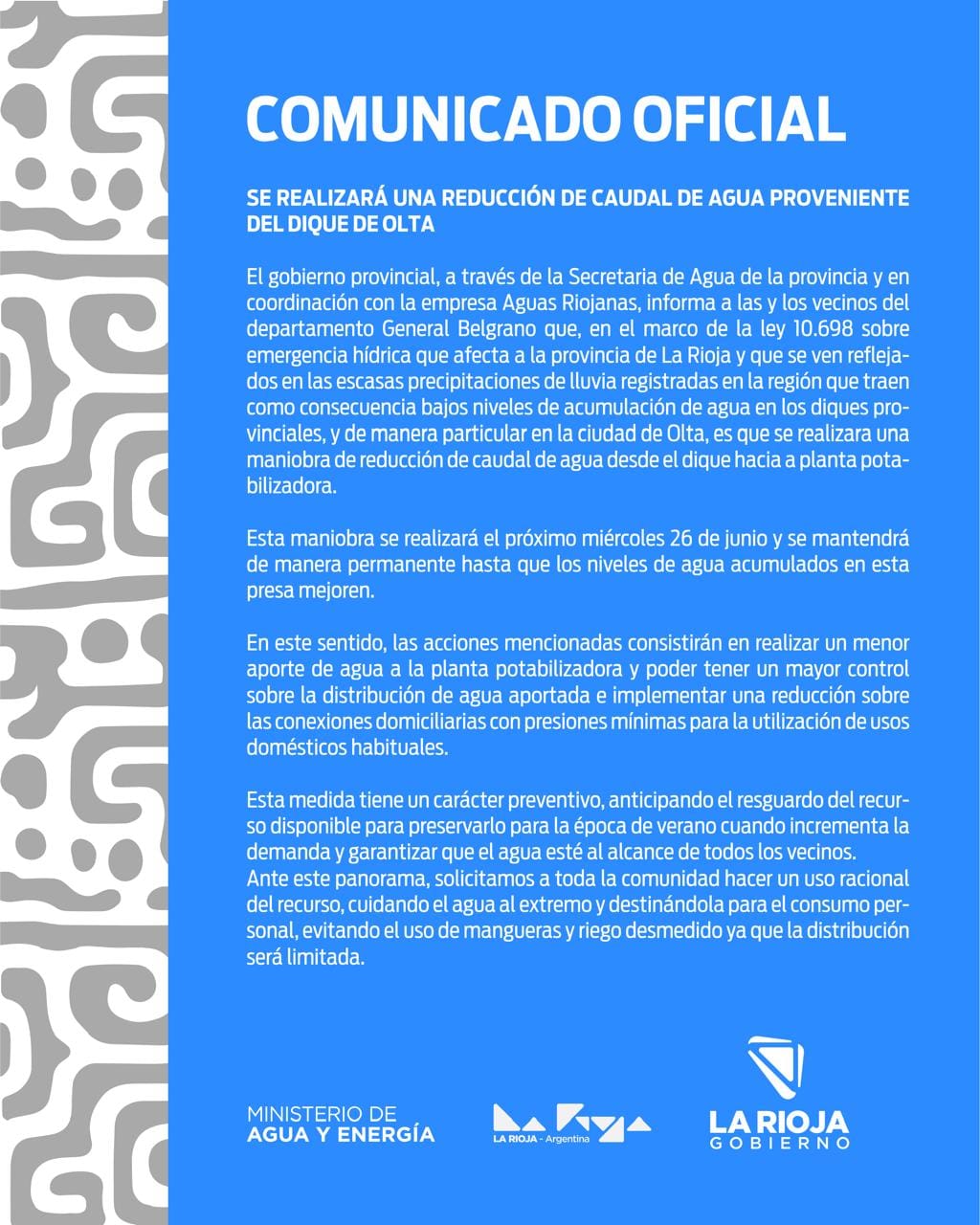 El gobierno provincial, a través de la Secretaria de Agua de la provincia y en coordinación con la empresa Aguas Riojanas, informa a las y los vecinos del departamento General Belgrano que, en el marco de la ley 10.630 sobre emergencia hídrica que afecta a la provincia de La Rioja y que se ven reflejados en las escasas precipitaciones de lluvia registradas en la región que traen como consecuencia bajos niveles de acumulación de agua en los diques provinciales, y de manera particular en la ciudad de Olta, es que se realizara una maniobra de reducción de caudal de agua desde el dique hacia a planta potabilizadora.