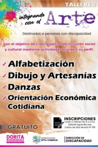 La Dirección de Discapacidad convoca a Personas con Discapacidad que quieran realizar actividades recreativas y de socialización en el marco de los talleres del Programa «Integrando diferencias a través del Arte» en el que se brindarán conocimientos sobre Dibujo y Artesanías, taller de Orientación Económica Cotidiana, taller de Alfabetización y taller de Danzas en un ambiente armonioso y recreativo.